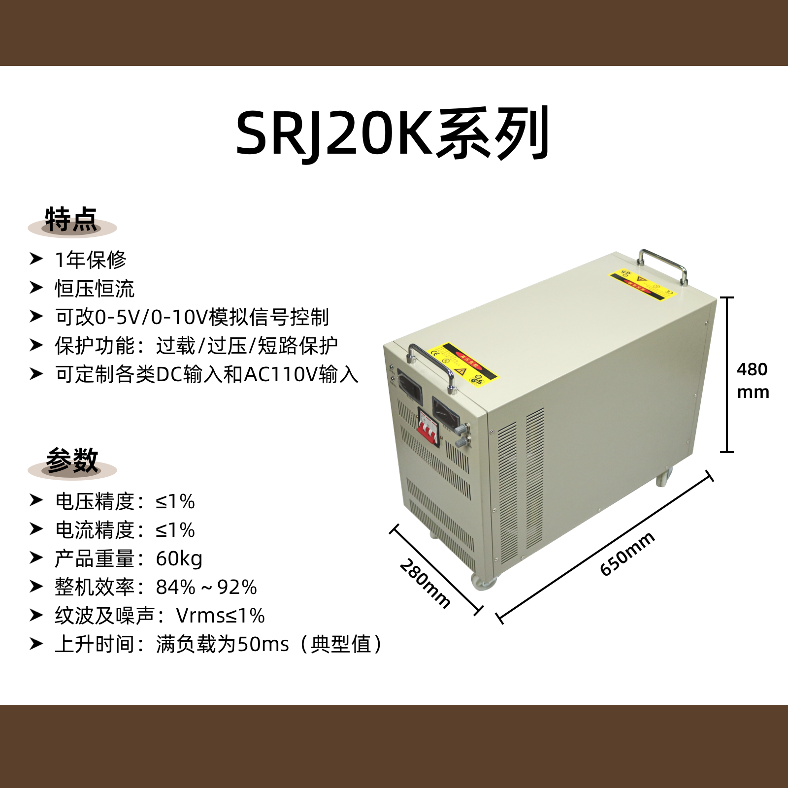 产品描述:SRJ20K 20KW工业级可编程直流电源系统,输入220VAC,输出12V/24V/48V至2000VDC超宽范围可调,具备高精度稳压稳流功能。专为电力电子测试、特种材料制备、储能设备老化、电解电镀等工业场景设计,为科研实验室和生产线提供稳定可靠的大功率直流供电解决方案。