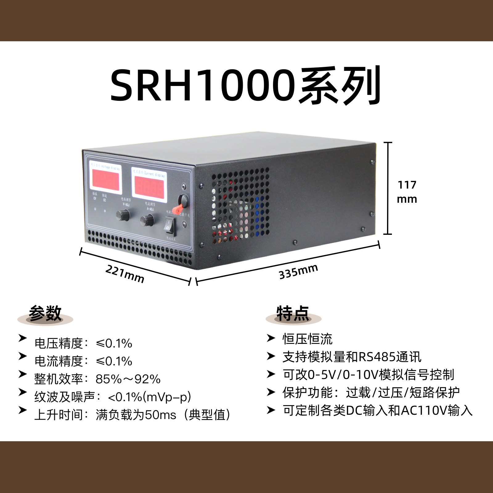 产品描述:SRH1000是一款工业通用型高压可调直流电源,输出覆盖0-800V/1KV可调,最大电流1.25A/1A,支持恒压稳压输出与升压功能。专为工业控制供电、高压器件测试、实验室调试、老化测试及设备维修等场景设计,具备高稳定性和多重保护,提供灵活可靠的高压直流电源解决方案。