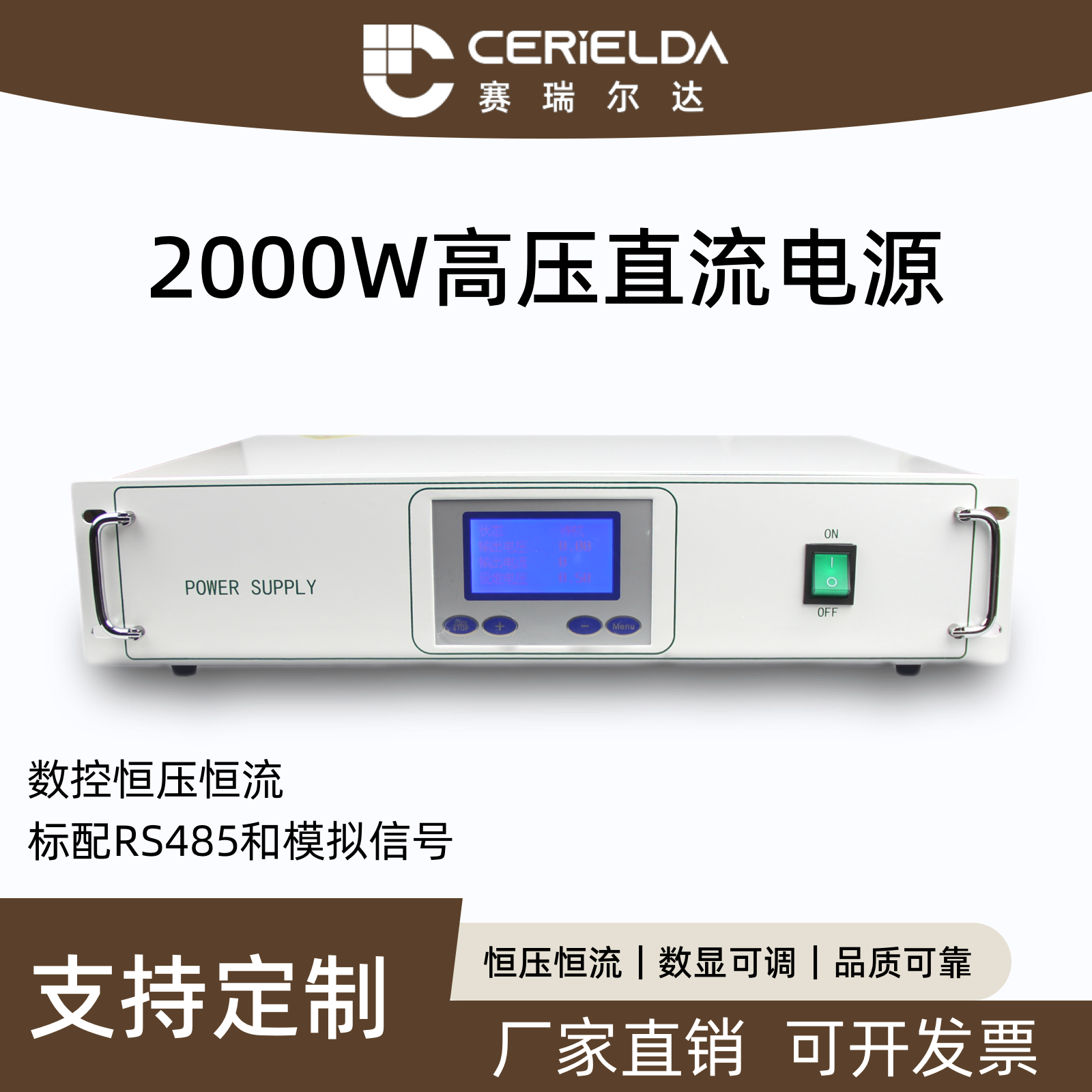 产品描述:SRW2000是一款大功率数控高压直流电源,输出电压范围5KV~300KV连续可调,最大输出功率2000W,具备恒压恒流工作模式和高精度数显功能。专为高要求的实验测试场景设计,适用于高压绝缘测试、X射线设备供电、电子束加工、材料击穿测试、科研实验等需要稳定大功率高压直流电源的工业与实验室应用,提供可靠的高压供电解决方案。