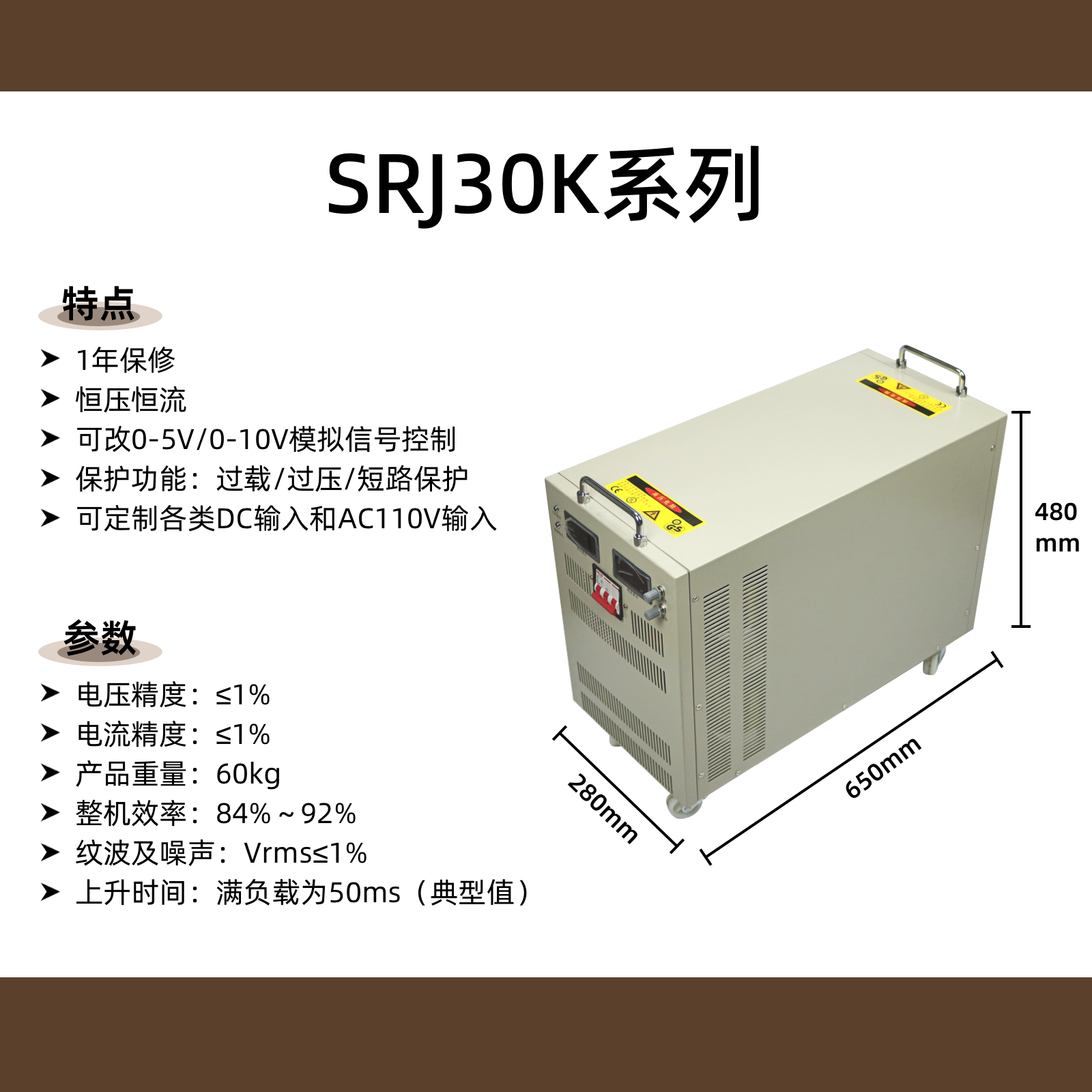 产品描述:SRJ30K 30KW工业级大功率可编程直流电源系统,输入220VAC,输出12V/24V/48V至2000VDC超宽范围高精度可调,具备完善的稳压、稳流功能。专为电力电子测试、特种材料制备、光伏/储能设备老化、电解电镀及科研实验室等高要求场景设计,提供稳定可靠的大功率直流供电与测试解决方案。