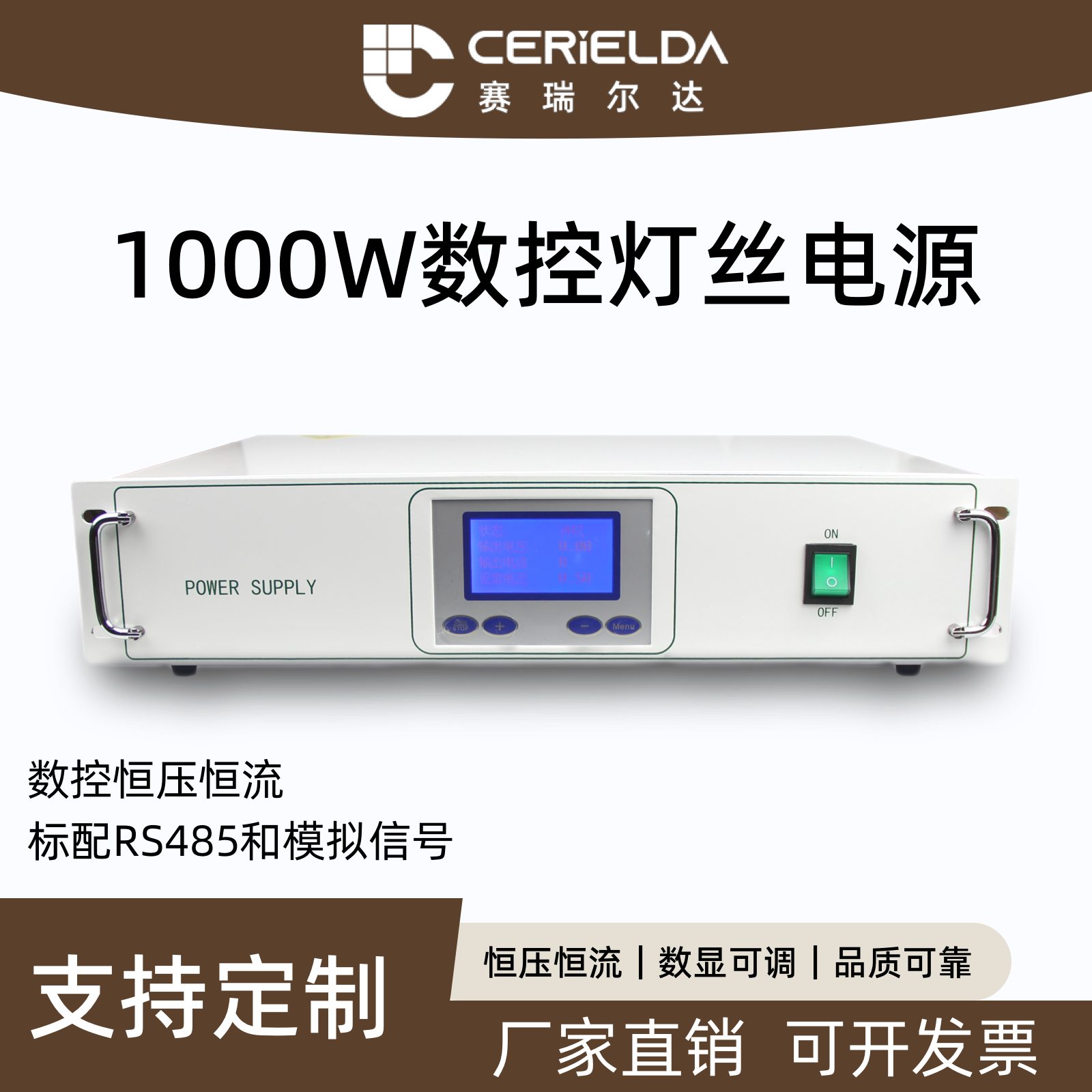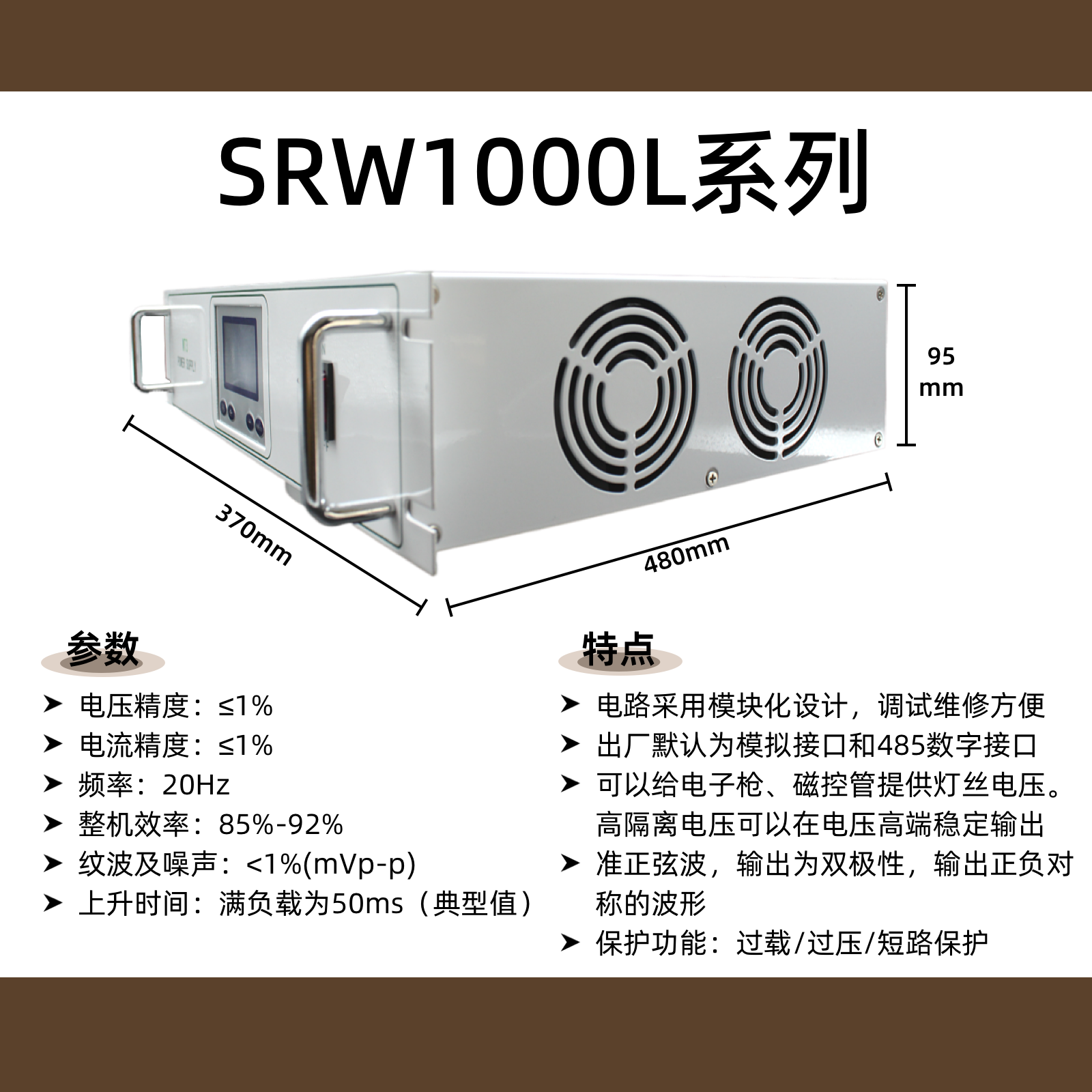 产品描述:SRW1000L是一款专业级数控灯丝电源,输出功率1000W,提供0-5V、0-10V、0-20V、0-50V多档电压可调输出,采用纯净正弦波输出,专为电子枪、磁控管、电子束蒸发源、真空镀膜设备等阴极加热应用设计。具备高稳定性、低噪声特性,支持精确的电流电压控制,适用于科研实验、工业生产中各类需要精密灯丝加热的真空电子设备。