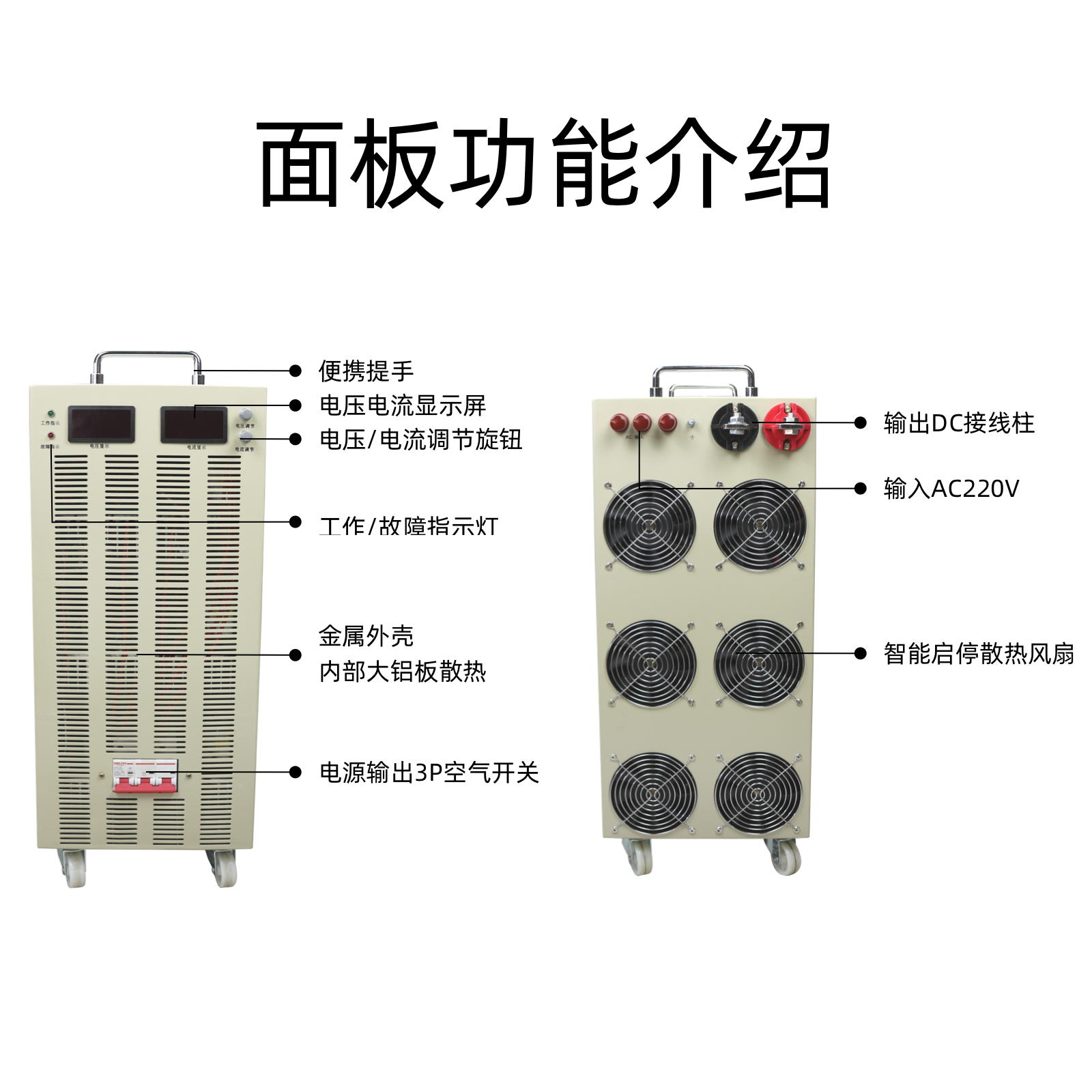 产品描述:专业提供45KW工业级大功率可编程直流电源系统,输入220VAC,输出支持12V/24V/48V至2000VDC超宽范围高精度可调,具备完善的稳压、稳流功能。专为电力电子测试、光伏逆变器老化、电解电镀、特种材料处理及高压实验室等严苛工业场景设计,提供稳定可靠的大功率直流供电与测试解决方案。
