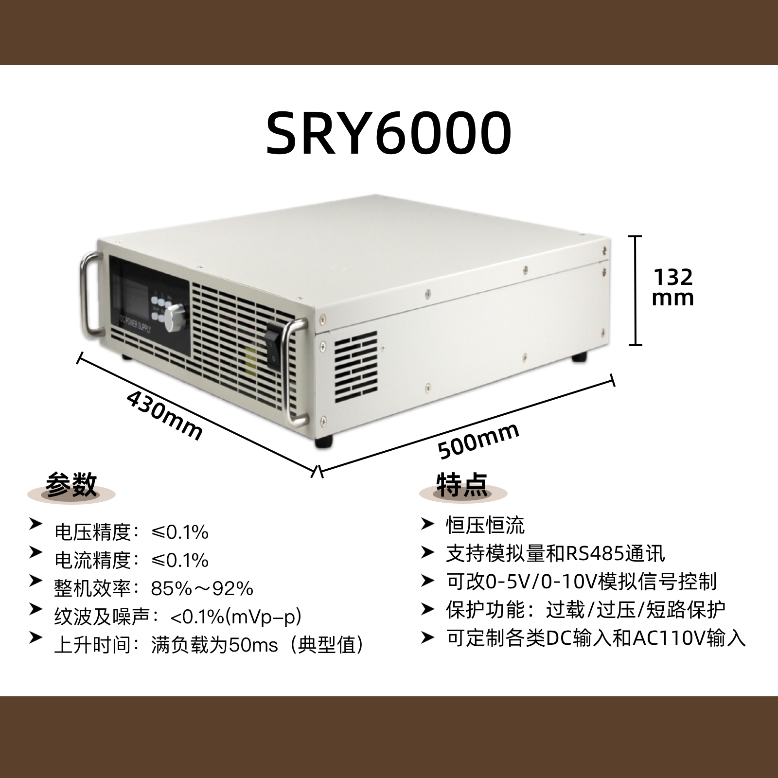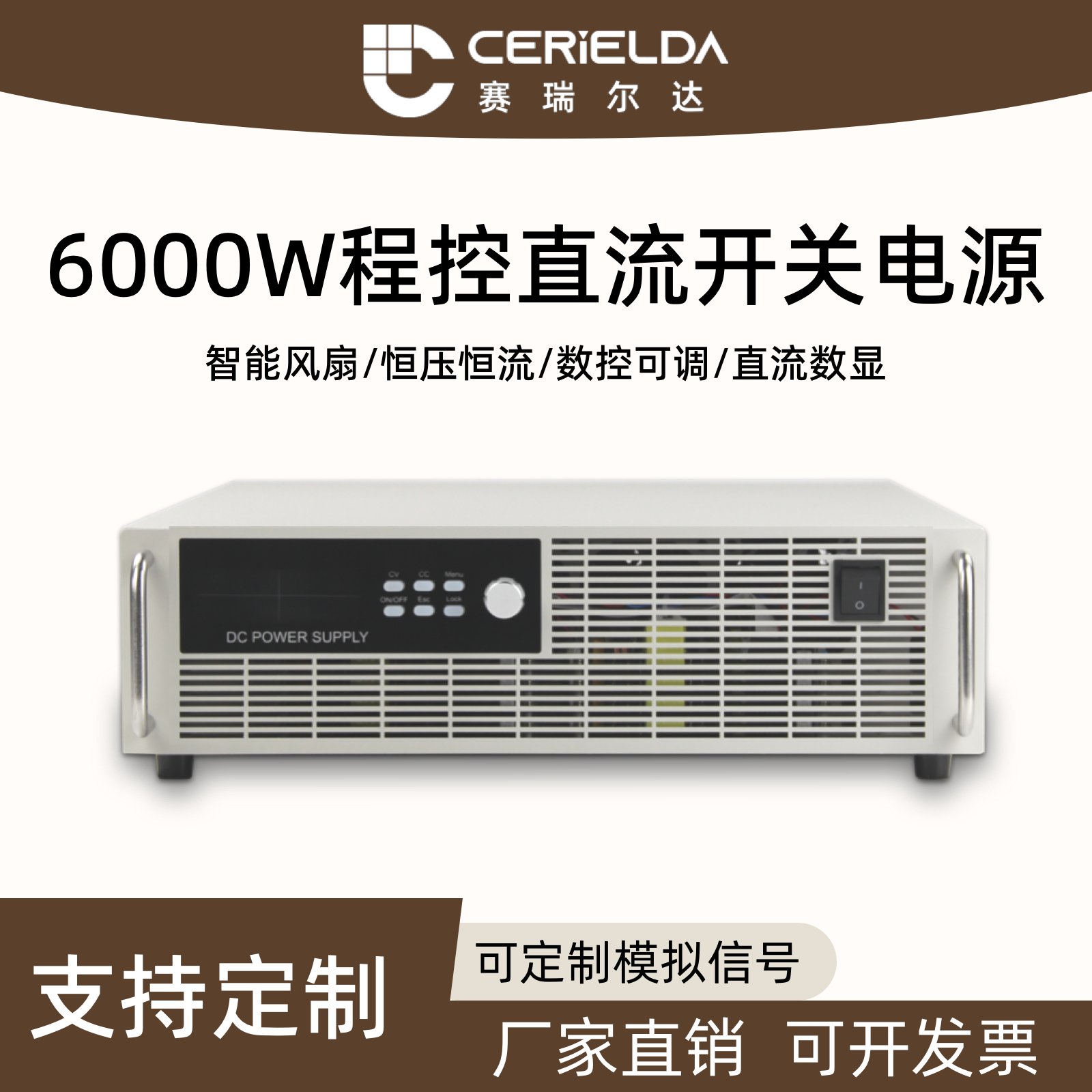 产品描述:SRY6000是一款6000W大功率可编程直流开关电源,支持220V输入,输出覆盖20V/80V/1KV多档可调,具备高精度稳压稳流功能。专为工业设备测试、大功率负载验证、电力电子研发、自动化产线集成等场景设计,提供稳定可靠、可控性强的大功率直流测试电源解决方案。