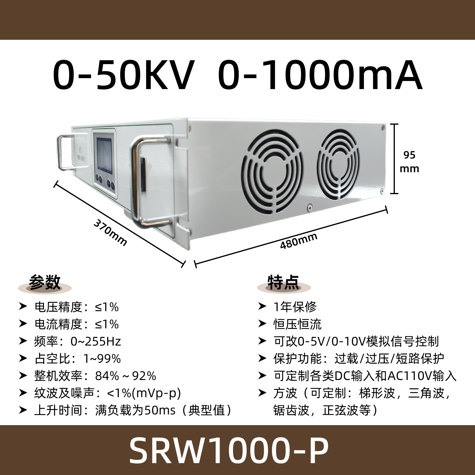 产品描述:SRW1000-P是一款低频单极性高压脉冲数控电源,输出电压1KV~50KV连续可调,功率1000W,支持恒压恒流工作模式。采用先进的数字控制技术,具备高精度输出和多级保护功能,专为静电除尘、等离子体生成、材料测试、实验室研究等高压应用场景设计,提供稳定可靠的高压脉冲解决方案。