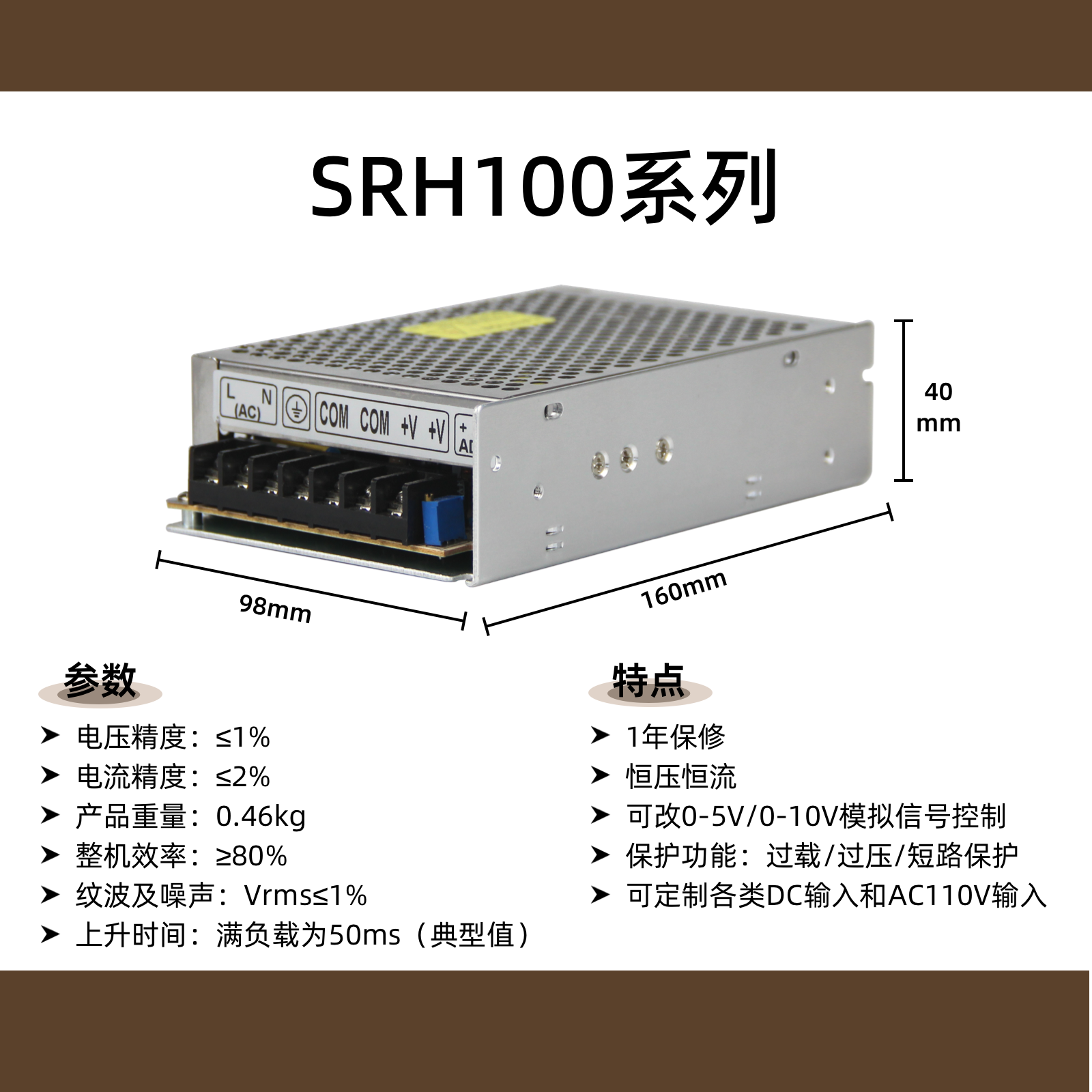 产品描述:SRH100型100W高精度可调直流开关电源,专为电子实验、设备维修及教学研发设计。输入220VAC,输出覆盖0-5V/12V/60V直流可调,具备恒压(CV)与恒流(CC)双模式及过载保护。体积小巧,适用于电路板调试、单片机开发、传感器供电、学校电子实验及精密仪器维修,是工作台和实验室的理想桌面电源。