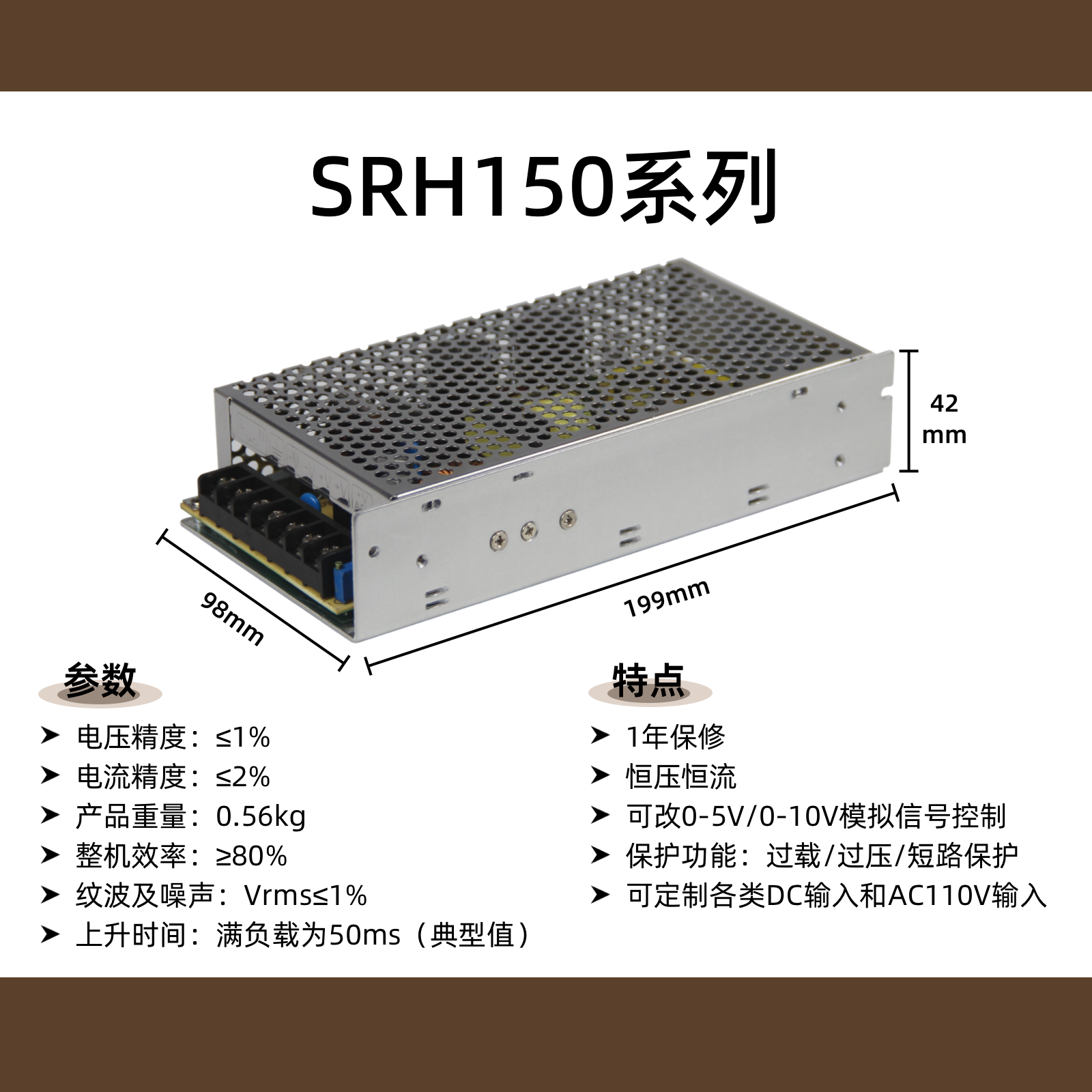 产品描述:SRH150型150W紧凑型可调开关电源,集监控供电、桌面研发与设备维修于一体。输入220VAC,输出0-5V/48V/150V宽范围可调,具备恒压(CV)与恒流(CC)双模式。特别适用于安防监控集中供电(POE交换机/摄像头调试)、精密电路板维修、实验室低压测试及小型LED项目,是工程师与安装人员的便携高效工具。