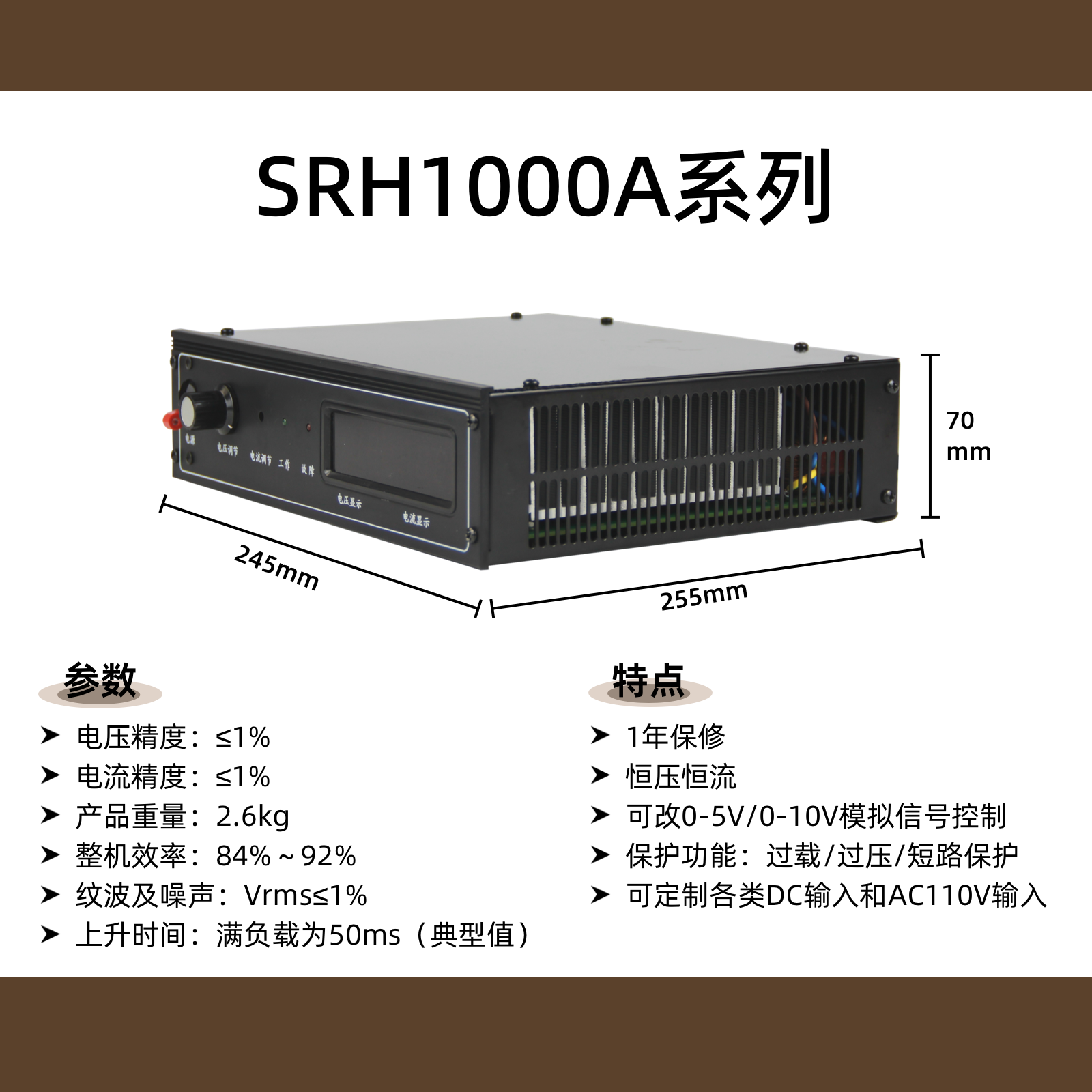 产品描述:SRH1000A 1000W(1KW)大功率可调直流电源,输入220VAC,输出支持12V/24V/48V至600VDC宽范围可调,具备高精度恒压(CV)与恒流(CC)功能。专为电子元器件高压测试、中小功率设备老化、实验室研发调试及工业控制供电等场景设计,兼具精密输出与高可靠性,是研发测试与产线应用的理想电源解决方案。
