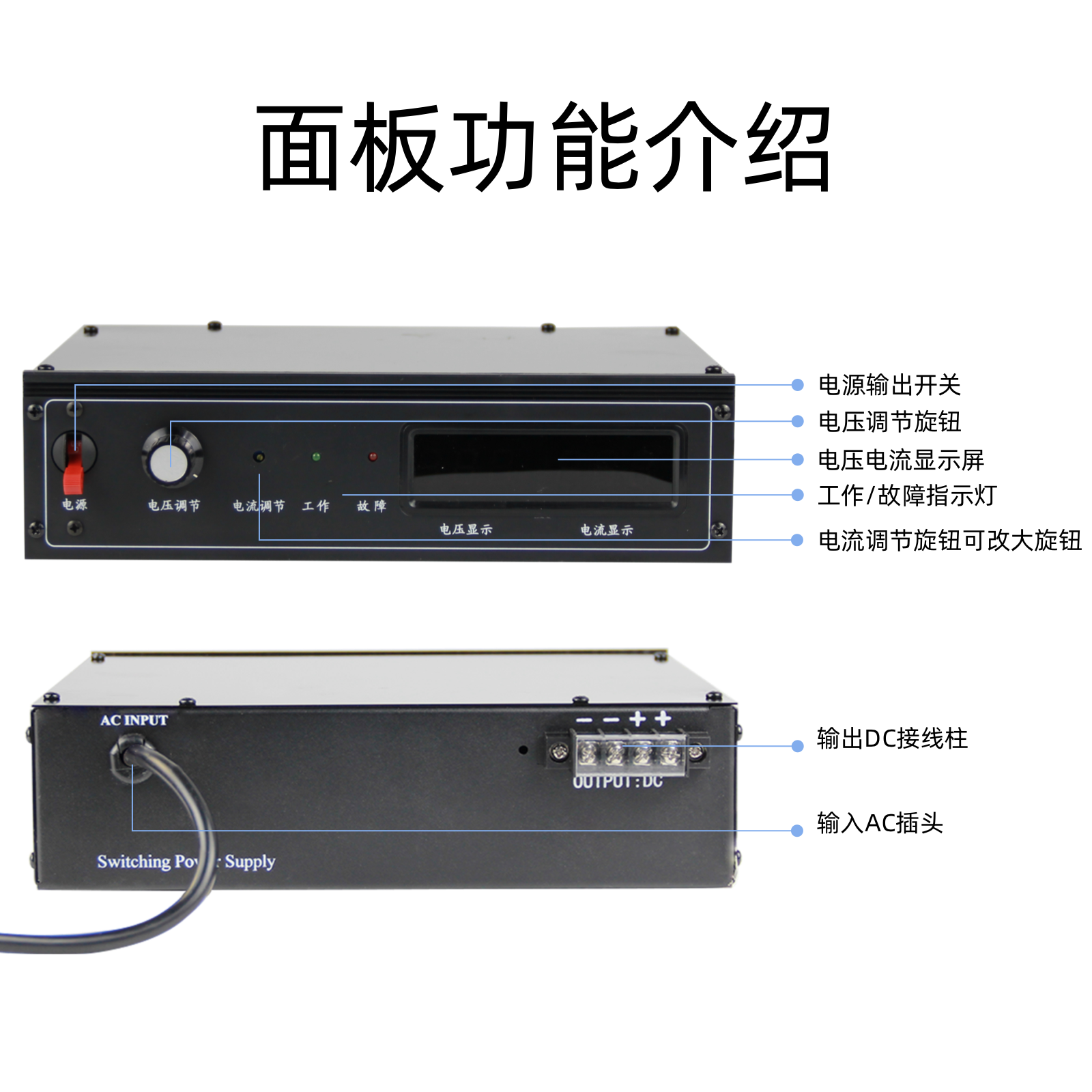 3. 电流调节起效值指电源输出可调限流的最小值,因电源个体差异,一般限流最小值≤2%的额定电流;