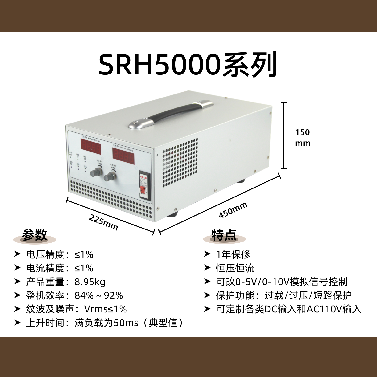 产品描述:SRH5000 5000W(5KW)大功率可调直流电源,输入220VAC,输出支持12V/24V/48VDC宽范围精密可调,具备完善的稳压与稳流功能。专为工业自动化产线调试、伺服驱动器测试、中型储能系统验证及通讯设备老化等场景设计,兼具高功率密度与稳定输出,提供高性价比的专业直流供电与测试解决方案。