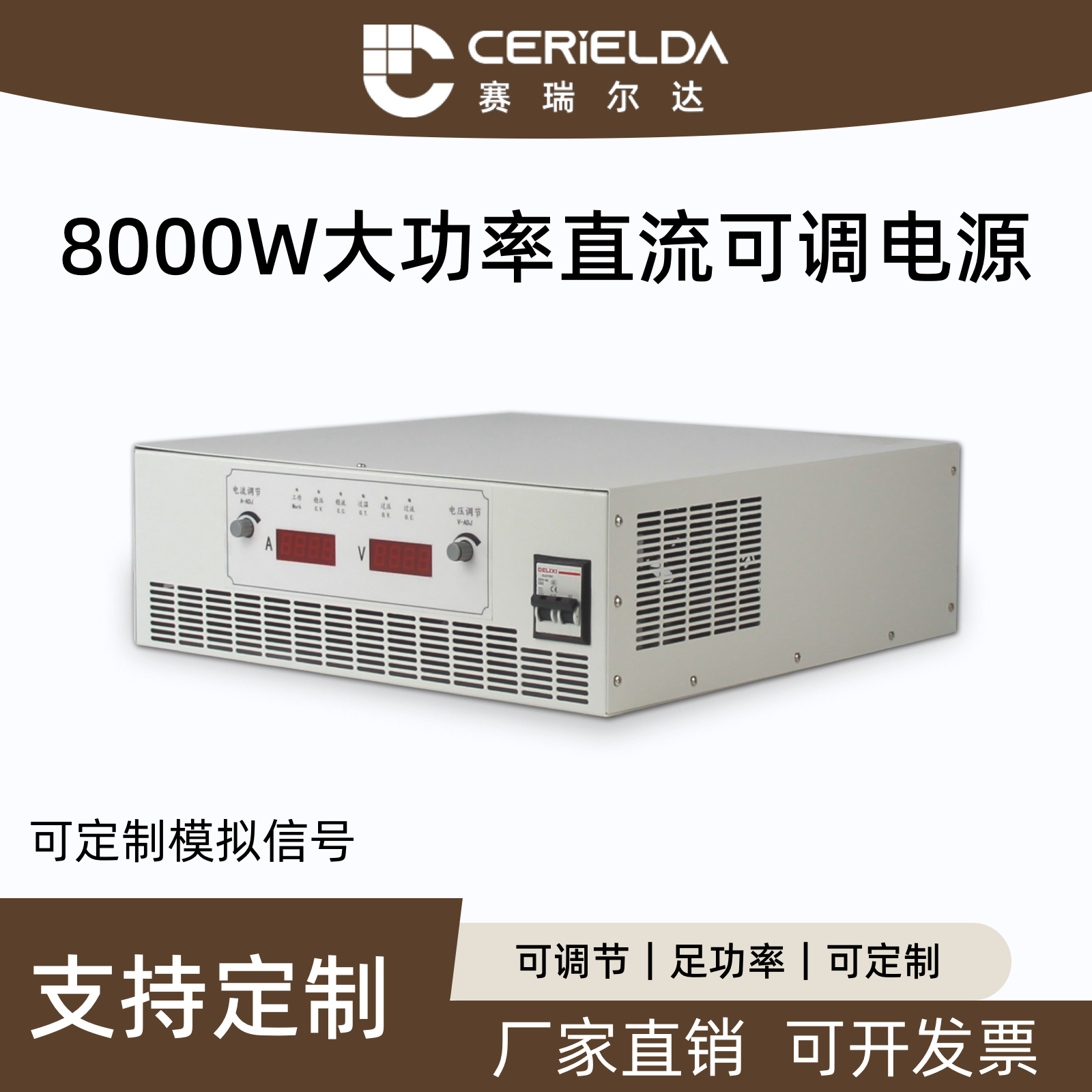 产品描述:SRH8000 8000W(8KW)大功率可调直流电源,输入220VAC,输出支持12V/24V/48V至1500VDC宽范围精密可调,具备完善的恒压(CV)与恒流(CC)功能。专为动力电池模组测试、电机控制器老化、光伏设备验证、高压元器件测试及工业研发等应用场景设计,提供高可靠性、高功率密度的专业直流供电与测试解决方案。
